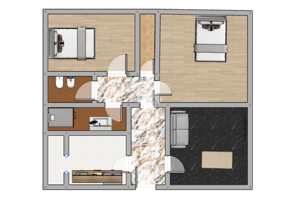 L’immobile è composto da cucina abitabile con disimpegno verandato, soggiorno spazioso con balcone, due camere da letto (una matrimoniale e una doppia), due bagni e ripostiglio.